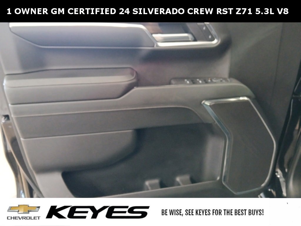 *CARFAX 1 owner*, *Clean CARFAX Vehicle History Report*, Inspected by Certified Technicians, GM Certified - 12/12 warranty & 100K powertrain warranty, Fresh oil change, Fully detailed, Bought New at Keyes, Service Records Available, Clean Local Trade In, 10-Speed Automatic, 4WD, Jet Black w/Cloth Seat Trim, 10-Way Power Driver Seat w/Lumbar, 12.3 Multicolor Reconfigurable Digital Display, 120-Volt Interior Power Outlet, 6-Speaker Audio System, All-Star Edition, All-Weather Floor Liner (LPO) (AAK), Alloy wheels, AM/FM radio: SiriusXM with 360L, Auto-Locking Rear Differential, Bluetooth® For Phone, Chevytec Spray-On Black Bedliner, Color-Keyed Carpeting Floor Covering, Convenience Package, Deep-Tinted Glass, Dual Exhaust w/Polished Outlets, Dual Rear USB Ports (Charge Only), Dual-Zone Automatic Climate Control, Electric Rear-Window Defogger, Electrical Steering Column Lock, Electronic Cruise Control, EZ Lift Power Lock & Release Tailgate, Front Center Armrest w/Storage, Front fog lights, Front Frame-Mounted Black Recovery Hooks, Front LED Fog Lamps, Front Rubberized Vinyl Floor Mats, HD Rear Vision Camera, Heated Driver & Front Outboard Passenger Seats, Heated front seats, Heated Power-Adjustable Outside Mirrors, Heated Steering Wheel, Heavy-Duty Air Filter, High Gloss Black Mirror Caps, Hill Descent Control, Inside Rear-View Mirror w/Tilt, Keyless Open & Start, LED Cargo Area Lighting, Off-Road Suspension, OnStar & Chevrolet Connected Services Capable, Power Front Windows w/Driver Express Up/Down, Power Front Windows w/Passenger Express Down, Power Rear Windows w/Express Down, Power steering, Preferred Equipment Group 1SP, Protection Package, Radio data system, Rear 60/40 Folding Bench Seat (Folds Up), Rear Rubberized-Vinyl Floor Mats, Rear Wheelhouse Liners, Remote keyless entry, Remote Vehicle Starter System, SiriusXM w/360L, Speed control, Standard Suspension Package, Standard Tailgate, Steering Wheel Audio Controls, Steering wheel mounted audio controls, Theft Deterrent System (Unauthorized Entry), Trailering Package, Wrapped Steering Wheel, Z71 Off-Road & Protection Package, Z71 Off-Road Package. Certified. Black 2024 Chevrolet Silverado 1500 RST 4D Crew Cab 4WD 10-Speed Automatic EcoTec3 5.3L V8