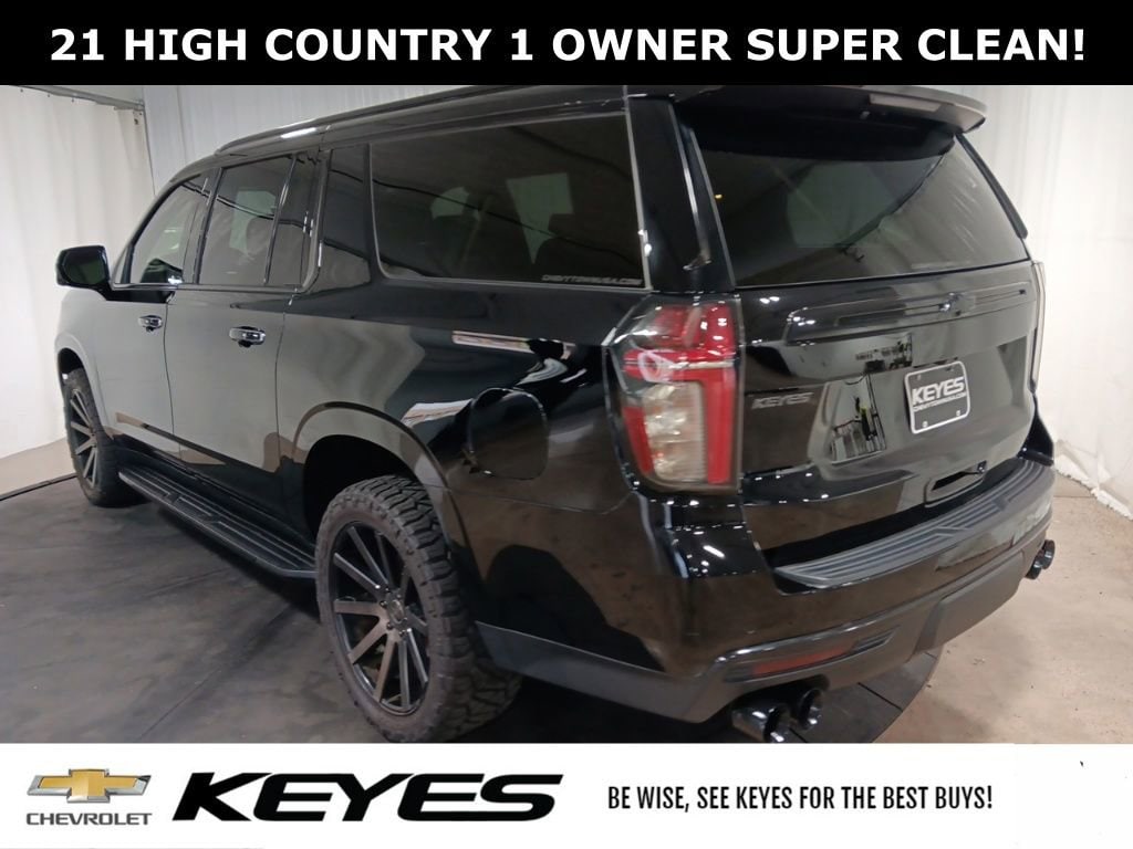 *CARFAX 1 owner*, *Clean CARFAX Vehicle History Report*, Inspected by Certified Technicians, Fresh oil change, Fully detailed, Bought New at Keyes, Service Records Available, 10 Speakers, 12-Way Power Driver & Passenger Seat Adjusters, 15 Diagonal Multi-Color Head-Up Display, 1st & 2nd Row Color-Keyed Carpeted Floor Mats, 2 USB Data Ports, 2-Speed Active Electronic AutoTrac Transfer Case, 3rd Row 60/40 Power-Folding Split-Bench, Adaptive suspension, Auto-leveling suspension, Automatic Heated Steering Wheel, Bose 10-Speaker Surround w/CenterPoint, Bright Front & Rear Door Sill Plates, Chrome Door Handles w/Body-Color Strip, Color-Keyed Carpeting Floor Covering, Driver & Front Outboard Passenger Airbags, Dual Exhaust System, Dual-Pane Power Panoramic Sunroof, Enhanced Driver Information Center, Floor Console w/Storage Area, Front & Rear Park Assist, Front Bucket Seats, Front Center Armrest, Hands-Free Rear Power Programmable Liftgate, HD Radio, HD Surround Vision, Heads-Up Display, Heated & Ventilated Driver & Front Passenger Seats, Heated 2nd Row Outboard Seats, Heated Driver & Front Passenger Seats, Heated front seats, Heated rear seats, Hill Descent Control, Infotainment Display, Inside Rearview Auto-Dimming Rear Camera Mirror, Lane Change Alert w/Side Blind Zone Alert, Lane Keep Assist w/Lane Departure Warning, Leather-Wrapped Steering Wheel, LED Daytime Running Lamps, License Plate Front Mounting Package, Magnetic Ride Control Suspension, Memory seat, Memory Settings, Navigation System, Outside Heated Power-Adjustable Mirrors, Perforated Leather Seating Surfaces, Power Liftgate, Power Release 2nd Row Bucket Seats, Power steering, Power Tilt & Telescopic Steering Column, Power windows, Preferred Equipment Group 3LZ, Premium audio system: Chevrolet Infotainment 3 Premium, Rear Camera Mirror Washer, Rear Cross Traffic Alert, Rear Pedestrian Alert, Remote keyless entry, Remote Start, Safety Alert Seat, SiriusXM Radio w/360L, Speed control, Steering wheel memory, Steering wheel mounted audio controls, Universal Home Remote. Black 2021 Chevrolet Suburban High Country 4D Sport Utility 4WD 10-Speed Automatic with Overdrive EcoTec3 6.2L V8