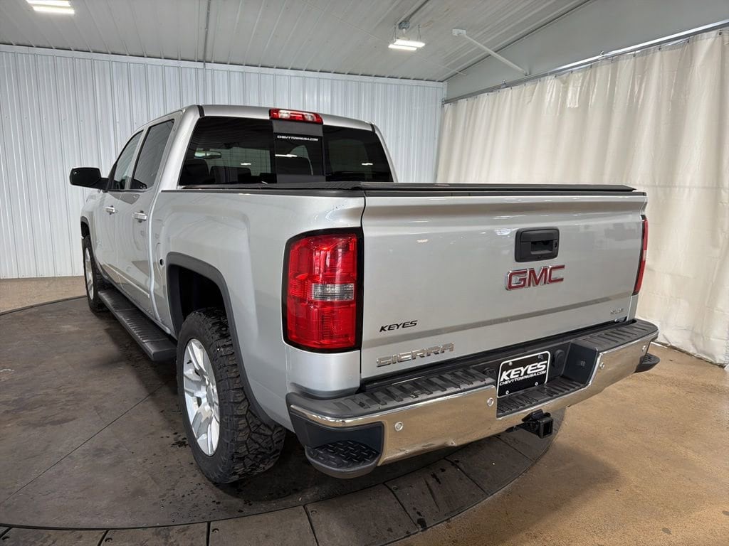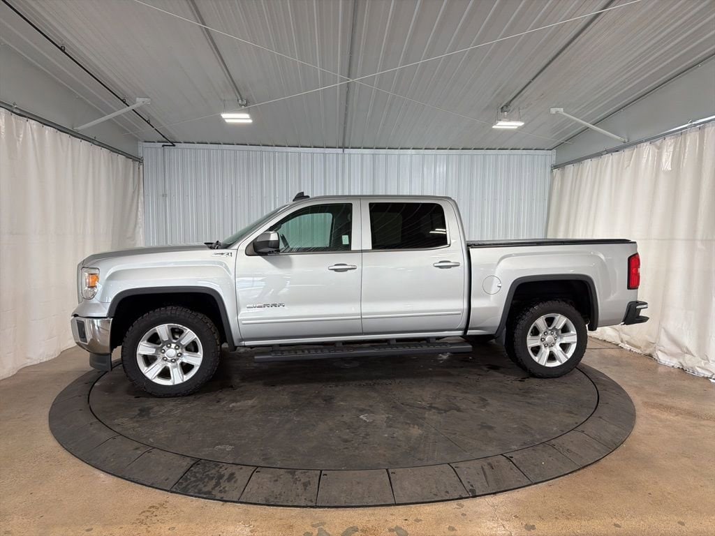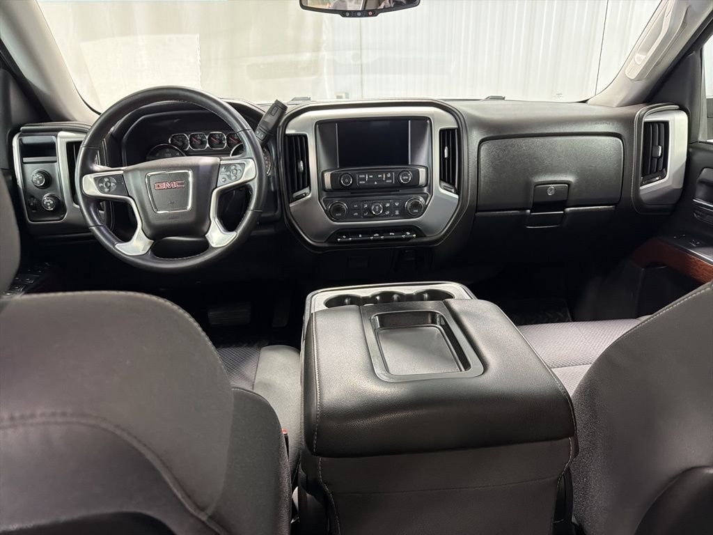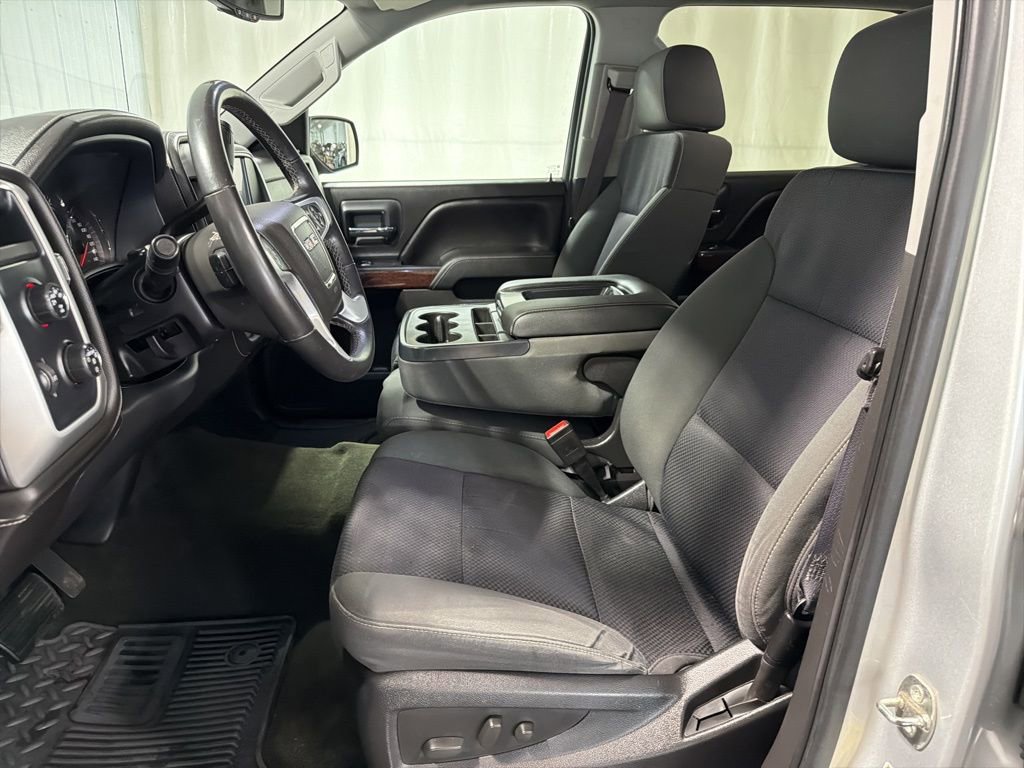 Inspected by Certified Technicians, Fresh oil change, Fully detailed, Clean Local Trade In, 6-Speed Automatic Electronic with Overdrive, 4WD, Jet Black w/Cloth Seat Trim, 10-Way Power Driver's Seat Adjuster, 110-Volt AC Power Outlet, 150 Amp Alternator, 4.2 Diagonal Color Display Driver Info Center, Body Color Bodyside Moldings, Body Color Door Handles, Body Color Power-Adjustable Heated Outside Mirrors, Body-Color Mirror Caps, CD player, Chrome Grille Surround, Color-Keyed Carpeting w/Rubberized Vinyl Floor Mats, Deep-Tinted Glass, Driver & Front Passenger Illuminated Vanity Mirrors, Dual-Zone Automatic Climate Control, Electric Rear-Window Defogger, Electronic Autotrac Transfer Case, EZ Lift & Lower Tailgate, Front Frame-Mounted Black Recovery Hooks, Front Halogen Fog Lamps, Heavy-Duty Rear Locking Differential, Hill Descent Control, Leather Wrapped Steering Wheel w/Cruise Controls, LED Cargo Box Lighting, Manual Tilt Wheel Steering Column, Off-Road Suspension Package, OnStar 6 Months Directions & Connections Plan, OnStar w/4G LTE, Power Adjustable Pedals, Power Sliding Rear Window, Power windows, Power Windows w/Driver Express Up & Down, Preferred Equipment Group 3SA, Premium audio system: IntelliLink, Radio: AM/FM Stereo w/8 Diagonal Color Touch Nav., Rear 60/40 Folding Bench Seat (Folds Up), Rear Vision Camera w/Dynamic Guide Lines, Rear Wheelhouse Liners, Remote Keyless Entry, Remote keyless entry, Remote Vehicle Starter System, Single Slot CD/MP3 Player, Single-Zone Air Conditioning, SiriusXM Satellite Radio, SLE Convenience Package, SLE Value Package, Speed control, Steering Wheel Audio Controls, Steering wheel mounted audio controls, Trailering Equipment, Ultrasonic Rear Park Assist, Universal Home Remote. Quicksilver Metallic 2015 GMC Sierra 1500 SLE 4D Crew Cab 4WD 6-Speed Automatic Electronic with Overdrive EcoTec3 5.3L V8